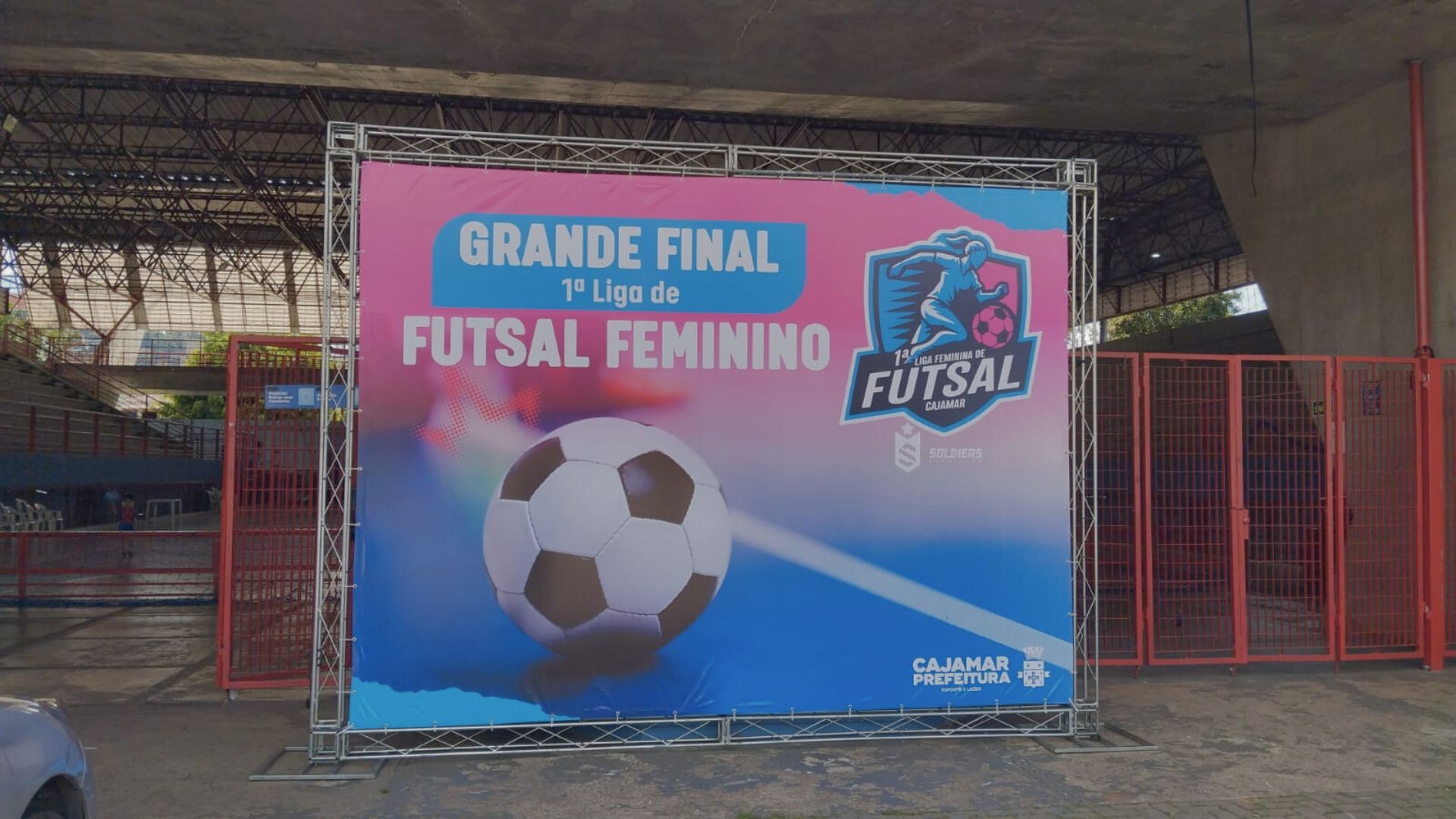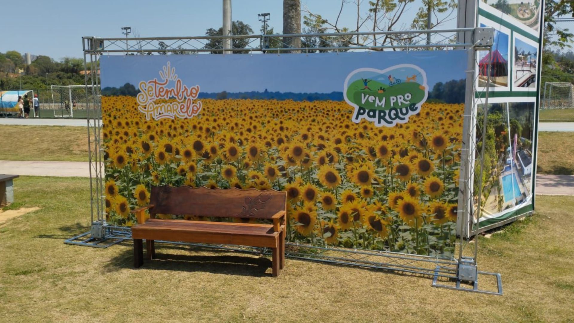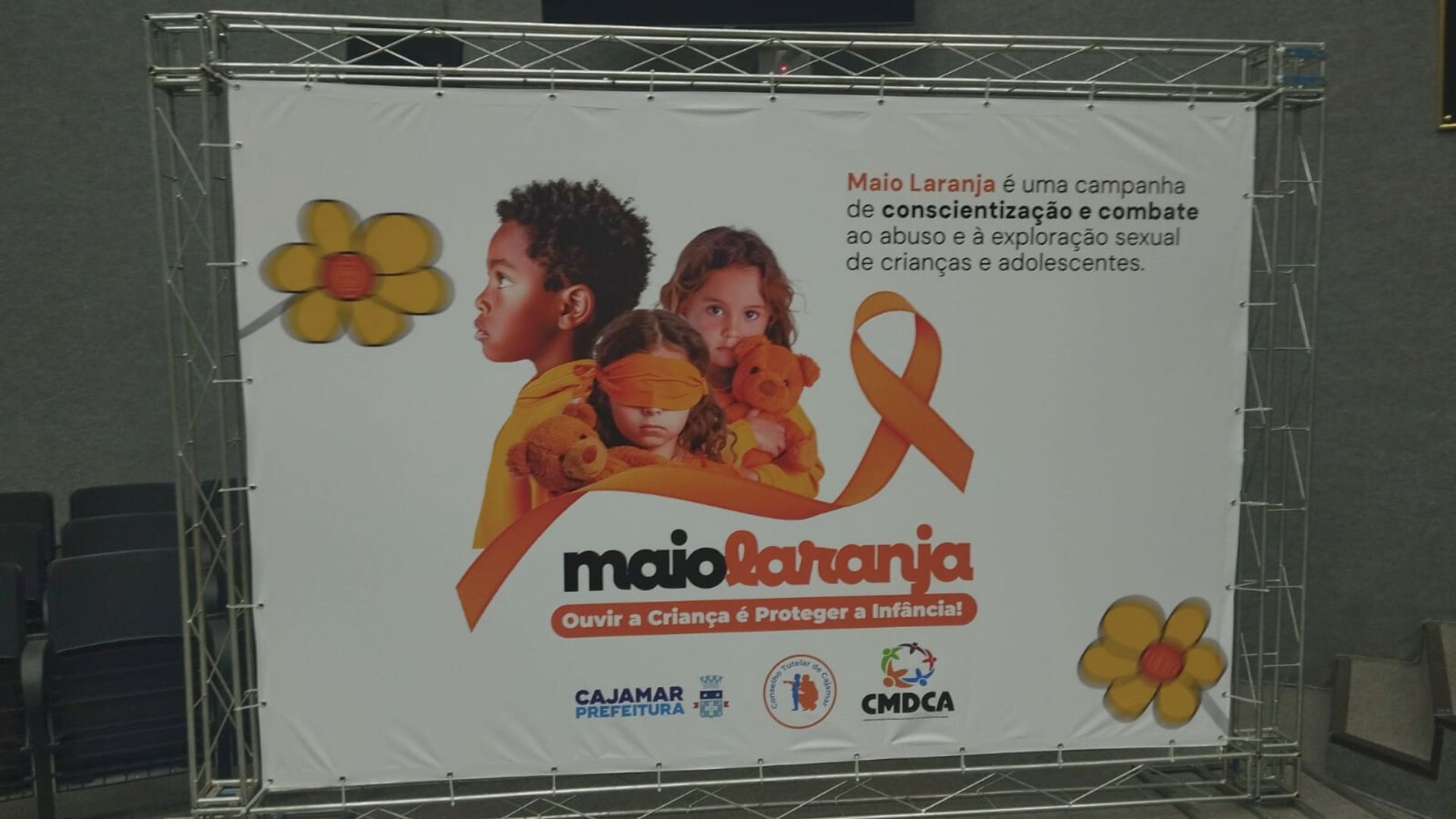 Além de reforçar a comunicação visual, o backdrop contribui para a estética e valorização do cenário principal do evento.