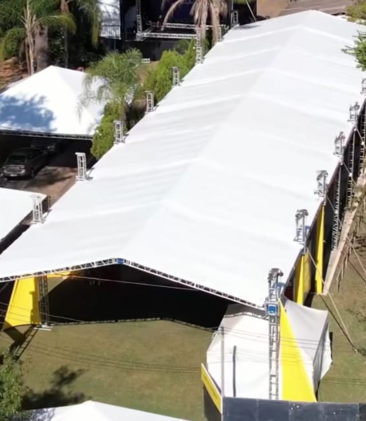 Estrutura – Produzida em alumínio de liga estrutural, com treliça Box Truss Q30. Utiliza spansets e catracas para tensionamento seguro.